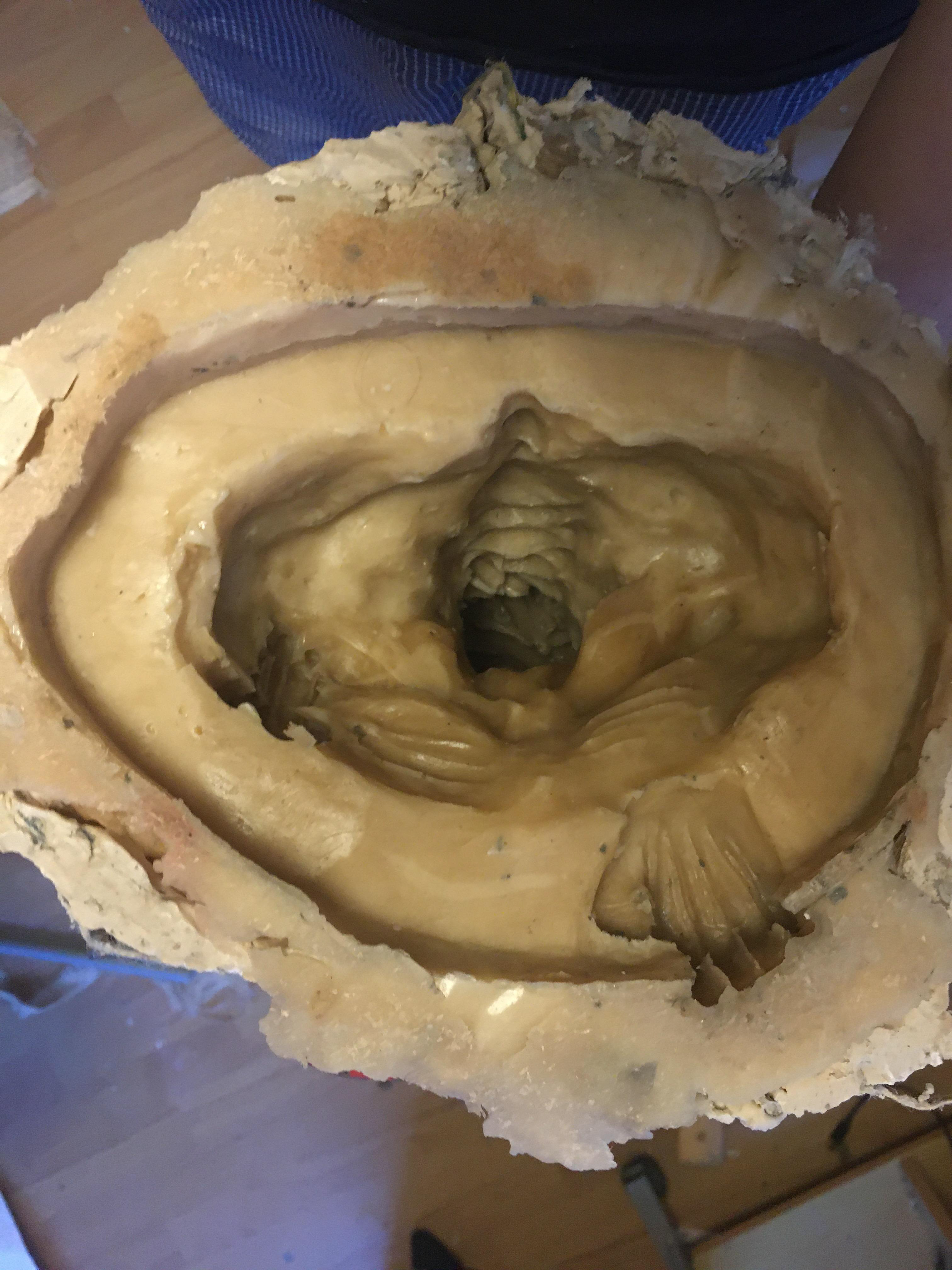 After the mould jacket has set, I then separate all sections of the mould. Making an incision along the centre line of the rubber to allow me to remove the clay from the inside of the mould.
