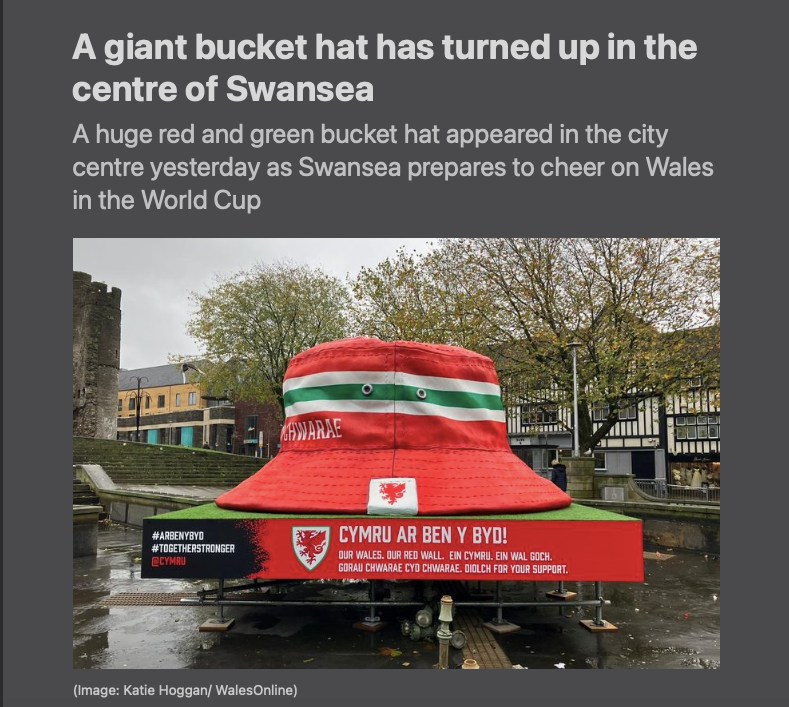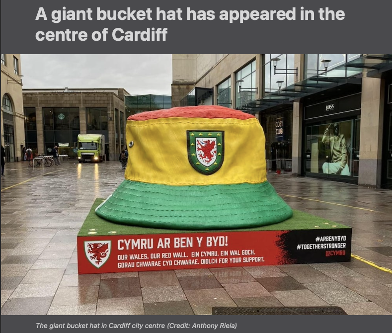A giant Welsh hat constructed for the Qatar 2022 World Cup. It was displayed in major cities around Wales. It was constructed from Polystyrene refined in Buff Clay and Cast in Fiberglass.
