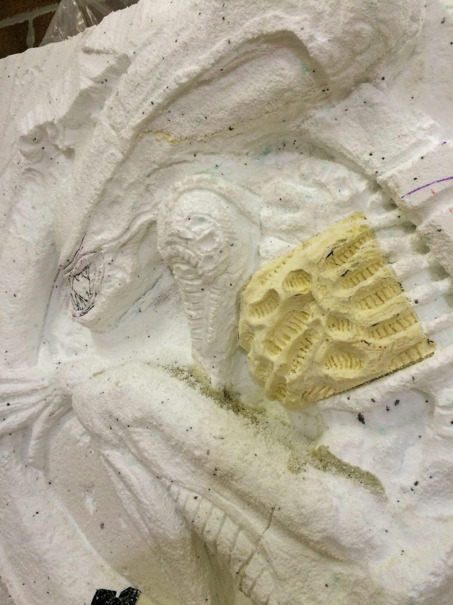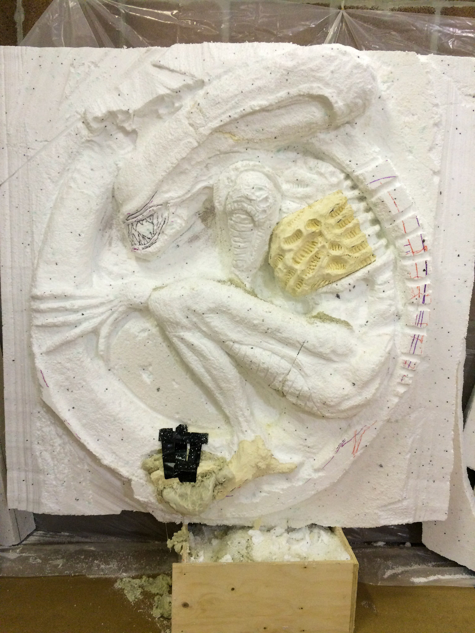 A small group project, reproducing the infamous Xenomorph from Ridley Scott's 'Alien' in high relief. Carved from several polystyrene blocks and sealed with Pva, Scrim and Idendon. It has been rendered to resemble bronze using brushed on metallic paint. The whole process from start to finish took four weeks.